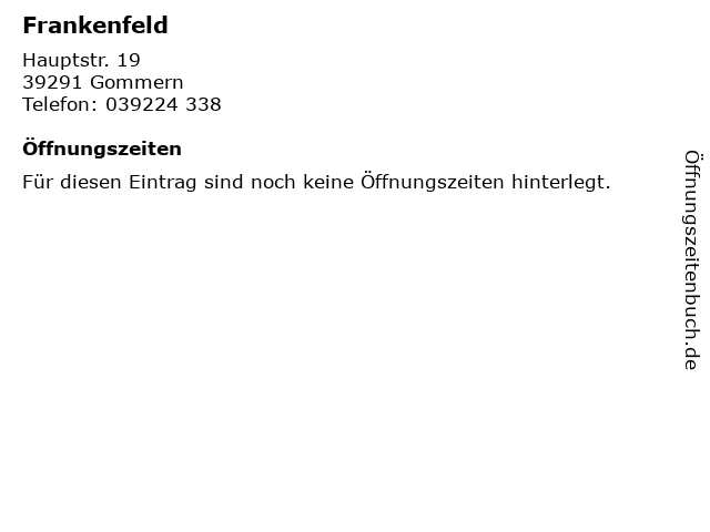 | Öffnungszeiten Frankenfeld in Gommern anzeigen | |