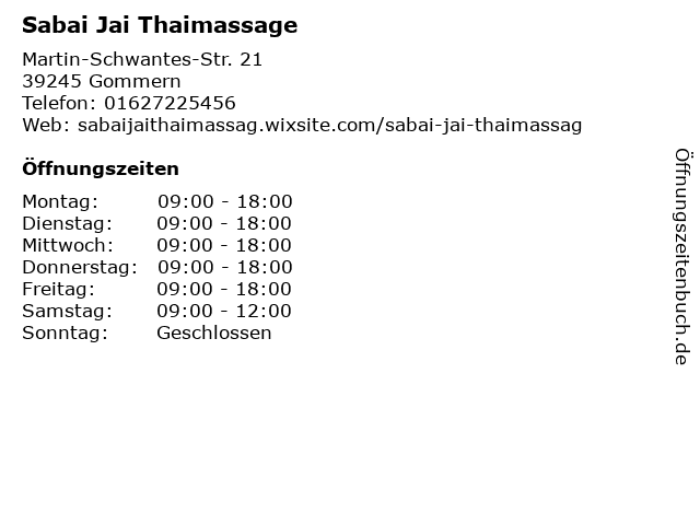 | Öffnungszeiten Sabai Jai Thaimassage in Gommern anzeigen | |