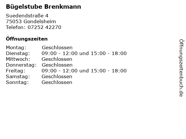 | Öffnungszeiten Bügelstube Brenkmann in Gondelsheim anzeigen | |