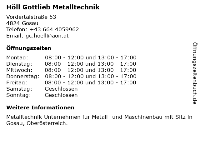Öffnungszeiten Höll Gottlieb Metalltechnik in Gosau anzeigen | |