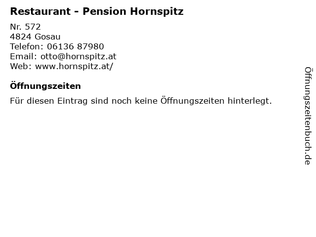 | Öffnungszeiten Restaurant - Pension Hornspitz in Gosau anzeigen | |