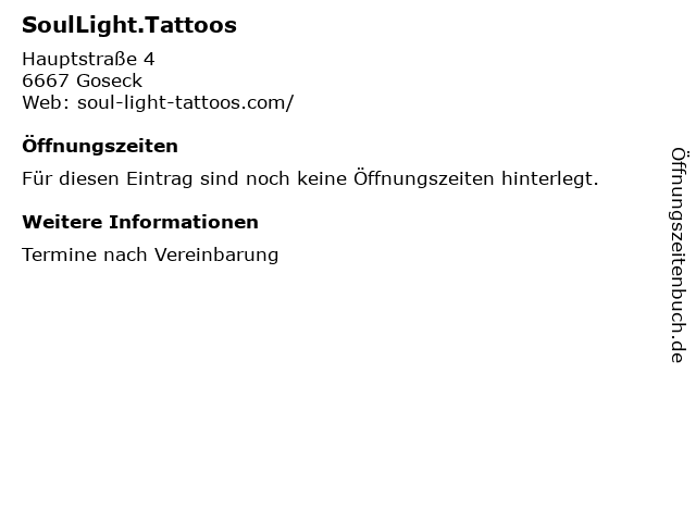 | Öffnungszeiten SoulLight.Tattoos in Goseck anzeigen | |