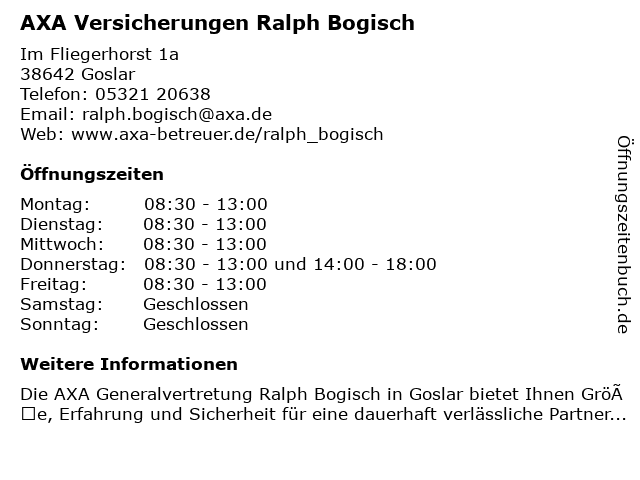 5 AXA Versicherung - Generalvertretung Dirk Straten (Entfernung: 2,54 km) Astfelder Str. 5, 38640 Goslar 6 |