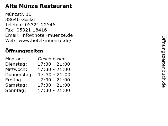 | Öffnungszeiten Alte Münze Restaurant in Goslar anzeigen | |