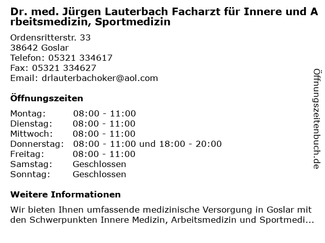 Branchen & Suchbegriffe zu Dr. med. Jürgen Lauterbach Facharzt für Innere und Arbeitsmedizin, Sportmedizin:arbeitsmedizin, dr., facharzt, innere, jürgen, med., sportmedizin |