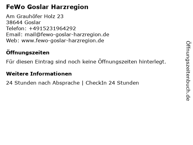 | Öffnungszeiten FeWo Goslar Harzregion in Goslar anzeigen | |