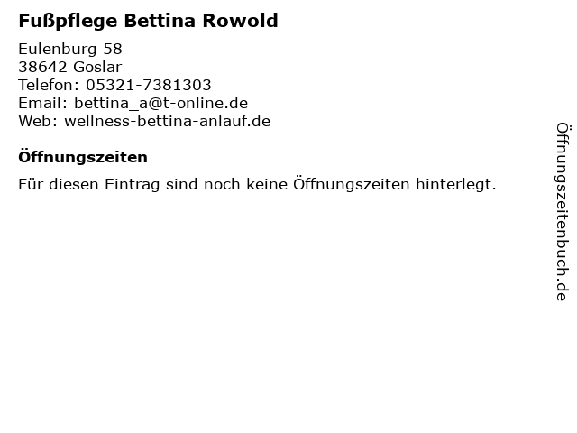 | Öffnungszeiten Fußpflege Bettina Rowold in Goslar anzeigen | |