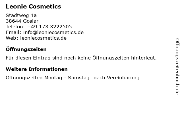 | Öffnungszeiten Leonie Cosmetics in Goslar anzeigen | |