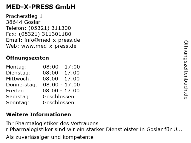 | Öffnungszeiten MED-X-PRESS GmbH in Goslar anzeigen | |
