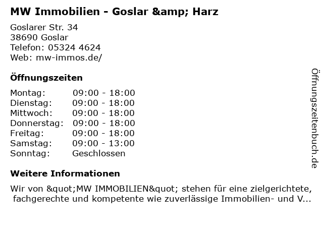 | Öffnungszeiten MW Immobilien - Goslar & Harz in Goslar anzeigen | |