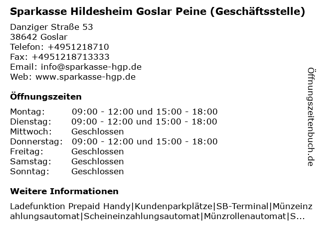 1 Sparkasse Hildesheim Goslar Peine (Beratungscenter) (Entfernung: 2,01 km) Jakobikirchhof 5-6, 38640 Goslar 2 Sparkasse Hildesheim Goslar Peine (Beratungscenter) (Entfernung: 14,33 km) Klesmerplatz 1, 38259 Salzgitter 3 Sparkasse Hildesheim Goslar Peine (Beratungscenter) (Entfernung: 14,98 km) Adolph-Roemer-Straße 10, 38678 Clausthal-Zellerfeld 4 Sparkasse Hildesheim Goslar Peine (Geldautomat) (Entfernung: 0,00 km) Danziger Straße 53, 38642 Goslar 6 |