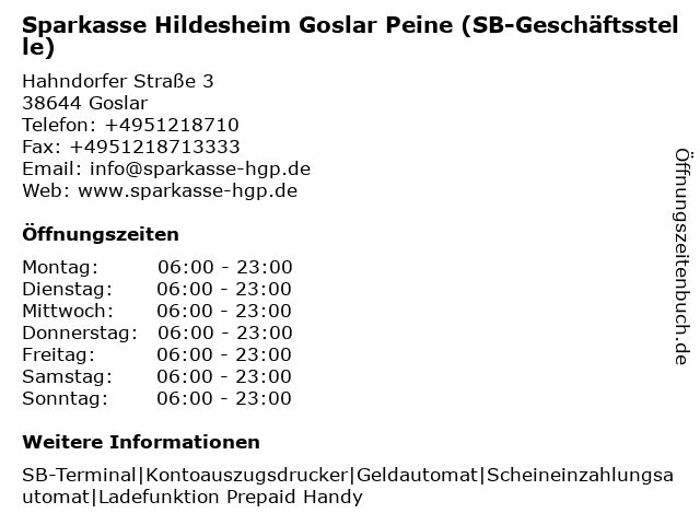 1 Sparkasse Hildesheim Goslar Peine (SB-Filiale) (Entfernung: 2,49 km) Carl-Zeiß-Straße 1, 38644 Goslar 5 Sparkasse Hildesheim Goslar Peine (SB-Filiale) (Entfernung: 6,22 km) Hauptstraße 13, 38704 Liebenburg 6 |
