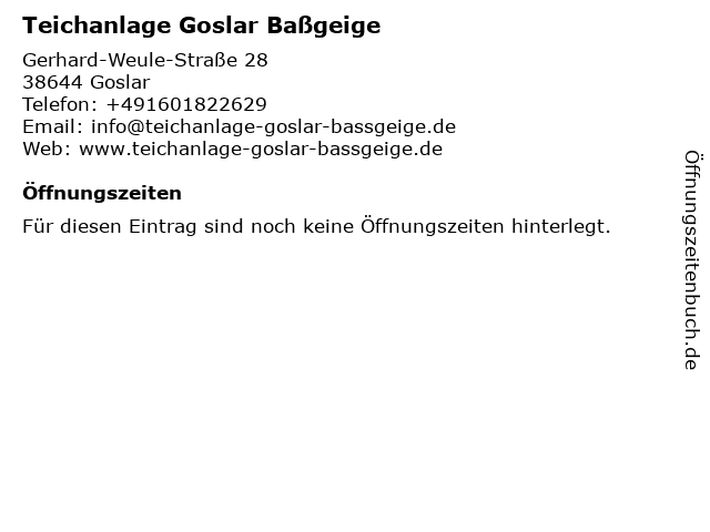 | Öffnungszeiten Teichanlage Goslar Baßgeige in Goslar anzeigen | |