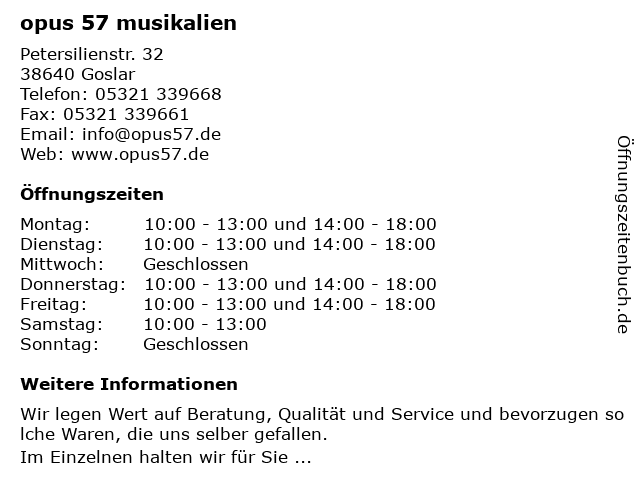 | Öffnungszeiten opus 57 musikalien in Goslar anzeigen | |