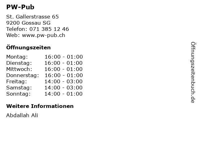 | Öffnungszeiten Circle Pub in Gossau SG anzeigen | |