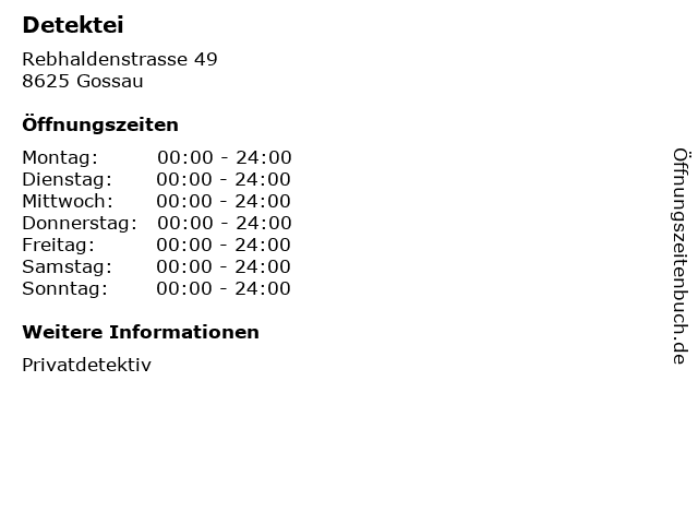| Öffnungszeiten Detektei in Gossau anzeigen | |