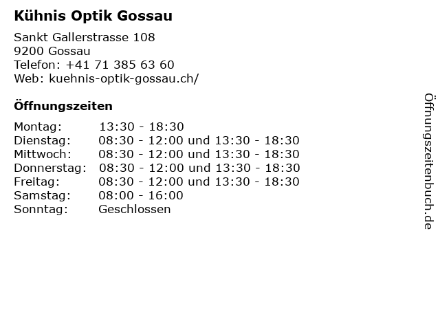 | Öffnungszeiten Kühnis Optik Gossau in Gossau anzeigen | |