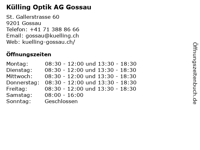 | Öffnungszeiten Külling Optik AG Gossau in Gossau anzeigen | |