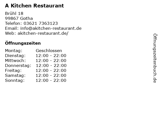 | Öffnungszeiten A Kitchen Restaurant in Gotha anzeigen | |