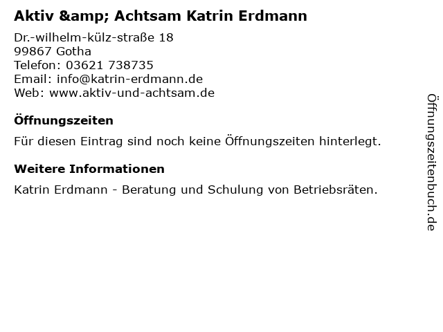 | Öffnungszeiten Aktiv & Achtsam Katrin Erdmann in Gotha anzeigen | |