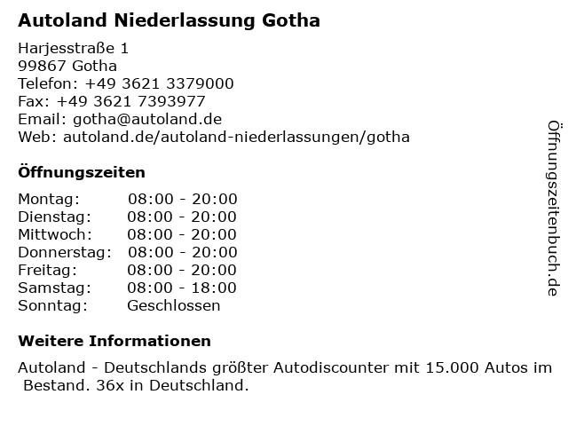| Öffnungszeiten Autoland Niederlassung Gotha in Gotha anzeigen | |