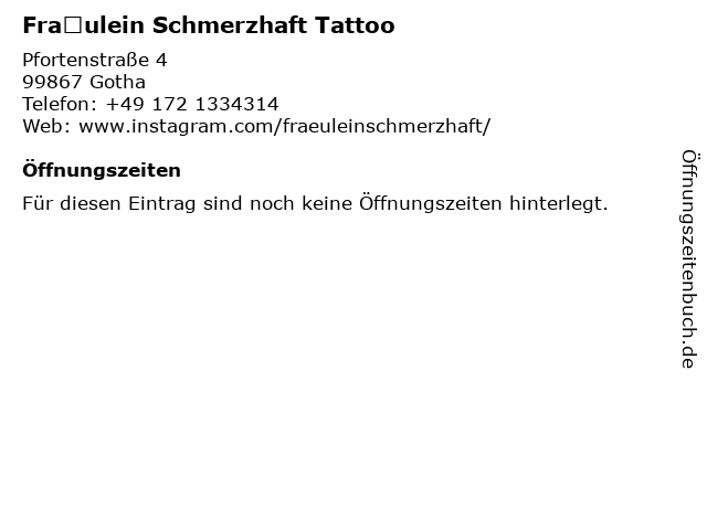 | Öffnungszeiten Fräulein Schmerzhaft Tattoo in Gotha anzeigen | |
