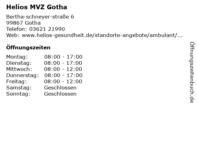 | Öffnungszeiten Helios MVZ Gotha in Gotha anzeigen | |