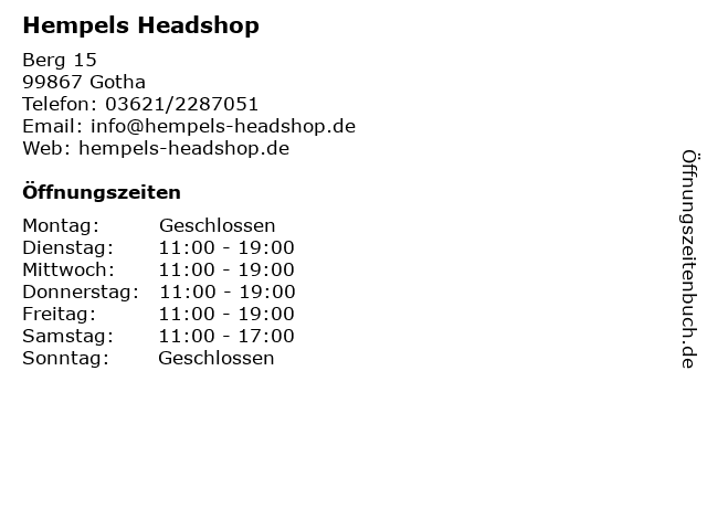 | Öffnungszeiten Hempels Headshop in Gotha anzeigen | |