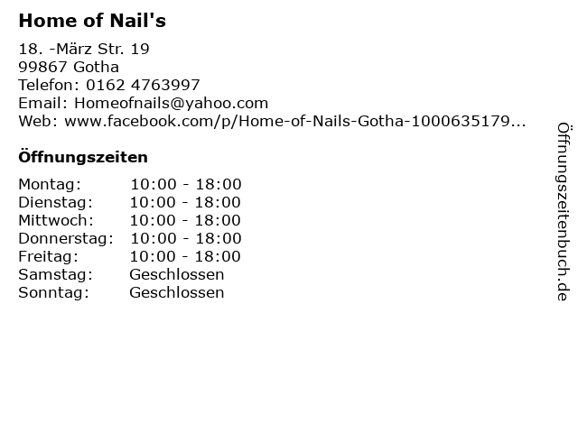 | Öffnungszeiten Home of Nail's in Gotha anzeigen | |