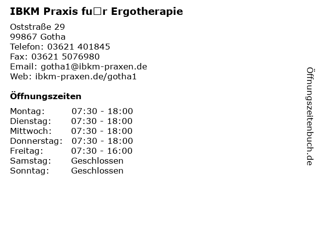 | Öffnungszeiten IBKM Praxis für Ergotherapie in Gotha anzeigen | |