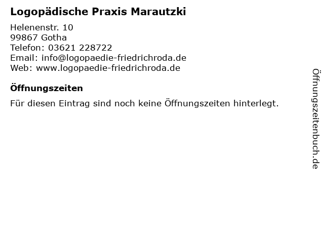 | Öffnungszeiten Logopädische Praxis Marautzki in Gotha anzeigen | |