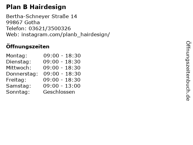 | Öffnungszeiten Plan B Hairdesign in Gotha anzeigen | |