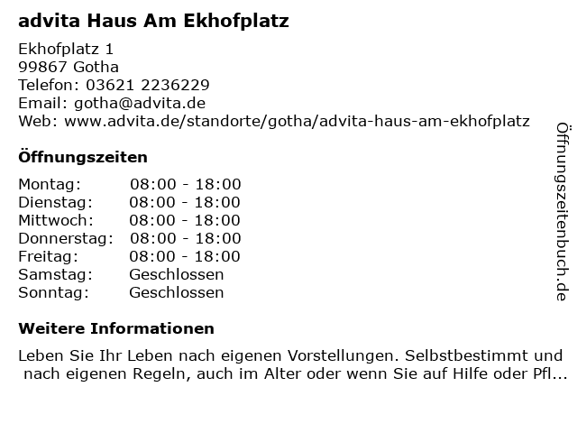 | Öffnungszeiten advita Haus Am Ekhofplatz in Gotha anzeigen | |
