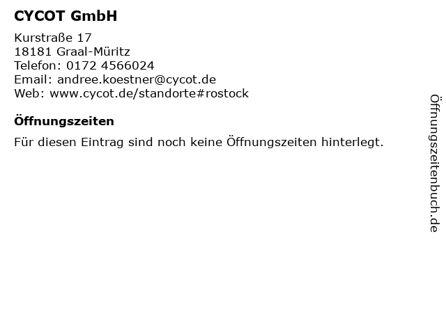 | Öffnungszeiten CYCOT GmbH in Graal-Müritz anzeigen | |