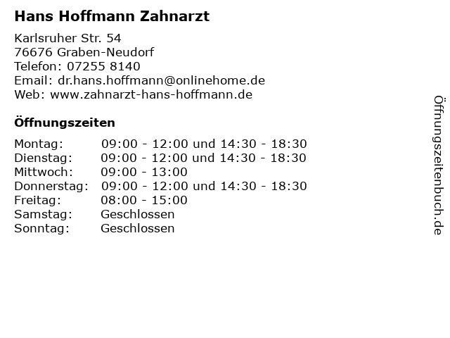 | Öffnungszeiten Hans Hoffmann Zahnarzt in Graben-Neudorf anzeigen | |