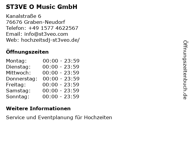 | Öffnungszeiten ST3VE O Music GmbH in Graben-Neudorf anzeigen | |