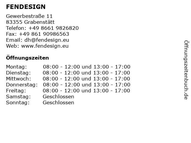 | Öffnungszeiten FENDESIGN in Grabenstätt anzeigen | |