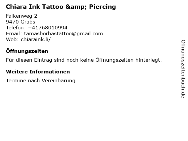 | Öffnungszeiten Chiara Ink Tattoo & Piercing in Grabs anzeigen | |