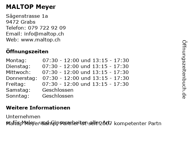 | Öffnungszeiten MALTOP Meyer in Grabs anzeigen | |