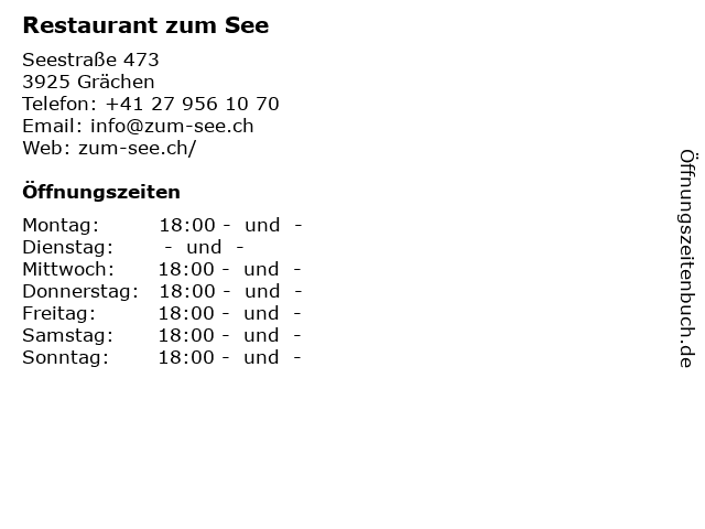 | Öffnungszeiten Restaurant zum See in Grächen anzeigen | |