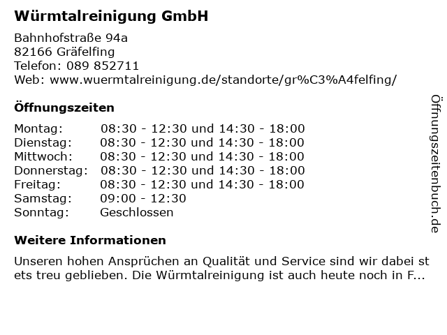 | Öffnungszeiten Würmtalreinigung GmbH in Gräfelfing anzeigen | |