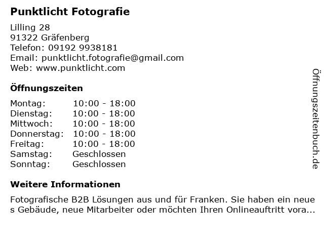 | Öffnungszeiten Punktlicht Fotografie in Gräfenberg anzeigen | |
