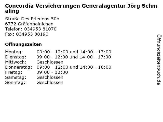 1 SIGNAL IDUNA Versicherung Generalagentur Kirchhof und Team - Versicherungsagentur (Entfernung: 7,28 km) Am Steinberg 9, 06774 Muldestausee 3 Concordia Versicherungen Geschäftsstelle Stefan Berr (Entfernung: 10,66 km) Am Markt 47, 06766 Bitterfeld-Wolfen 4 Deutscher Ring Lebensversicherung AG Wolfgang Bieneck Generalagentur (Entfernung: 11,35 km) Wittener Str. 9, 06766 Bitterfeld-Wolfen 5 SIGNAL IDUNA Generalagentur Petra Wießner & Team (Entfernung: 11,71 km) Binnengärtenstr. 12, 06749 Bitterfeld-Wolfen 6 Concordia Versicherungen Geschäftsstelle Dirk Schröter-Baumgarth (Entfernung: 11,90 km) Mittelstraße 19, 06749 Bitterfeld-Wolfen |