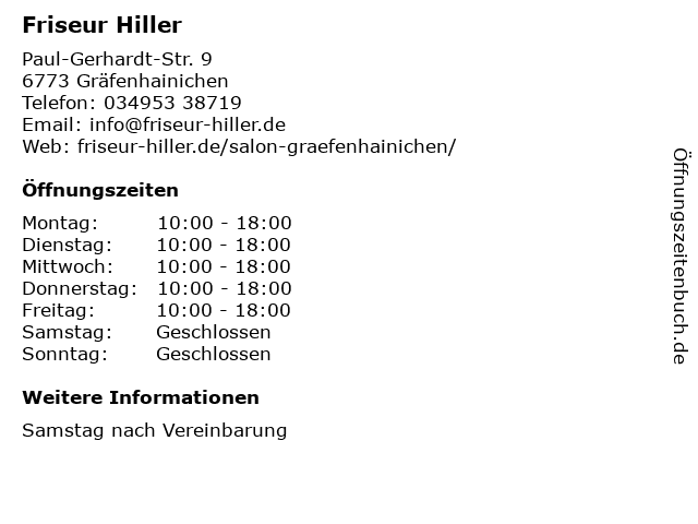 | Öffnungszeiten Friseur Hiller in Gräfenhainichen anzeigen | |