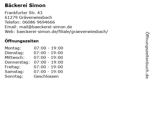 | Öffnungszeiten Bäckerei Simon in Grävenwiesbach anzeigen | |