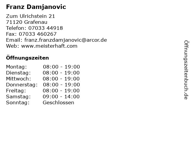 | Öffnungszeiten Franz Damjanovic in Grafenau anzeigen | |