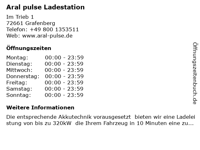 | Öffnungszeiten Aral pulse Ladestation in Grafenberg anzeigen | |