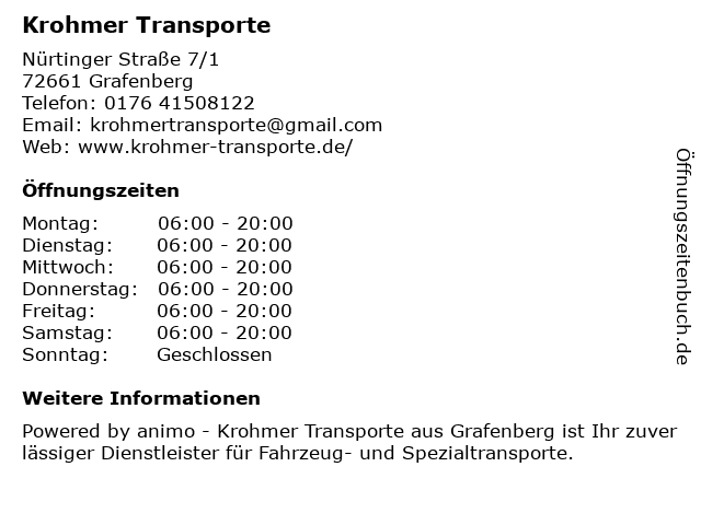 | Öffnungszeiten Krohmer Transporte in Grafenberg anzeigen | |