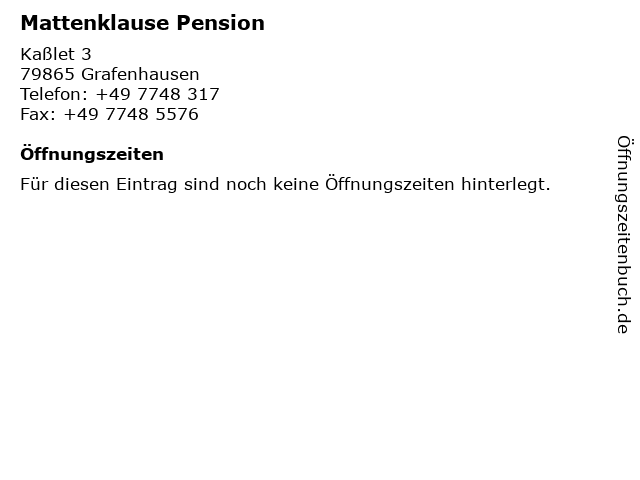 | Öffnungszeiten Mattenklause Pension in Grafenhausen anzeigen | |