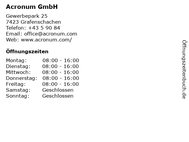 | Öffnungszeiten Acronum GmbH in Grafenschachen anzeigen | |